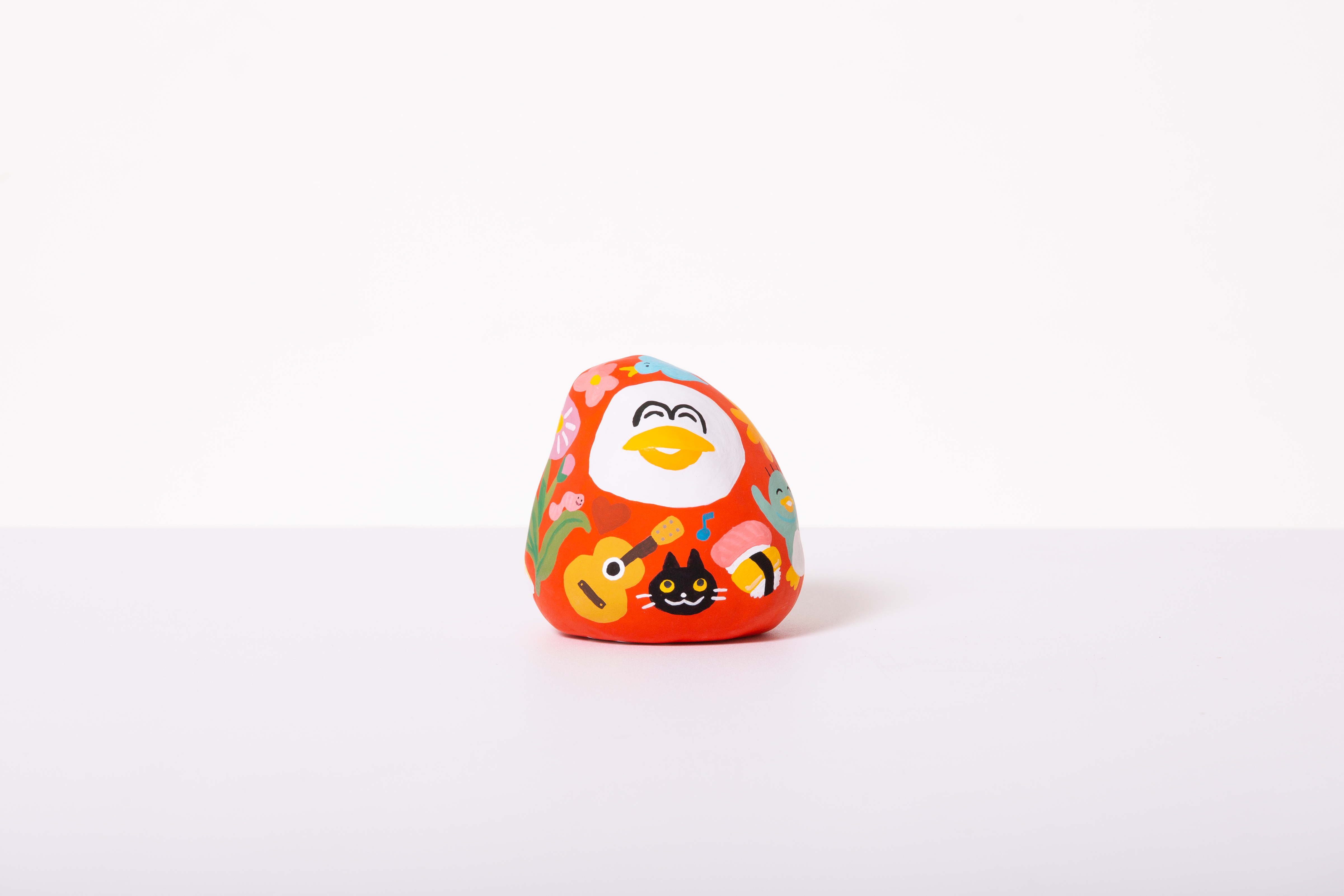 そんな強く勇ましい思いとは少し違いますが、置いてるとなんだか楽しい気持ちになるようなだるまを制作しました。普段平面に描いているキャラクターを立体におこすのは新鮮な気持ちでした。背中まで見ていただけたら嬉しいです。